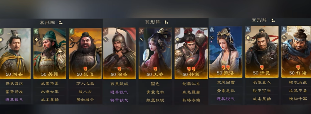 1. 桃园队:刘备、关羽、张飞。如果运气好刷到张飞的经书,可以将战八方换成其他兵刃战法。属性加点时,张飞的天空要比关羽高。