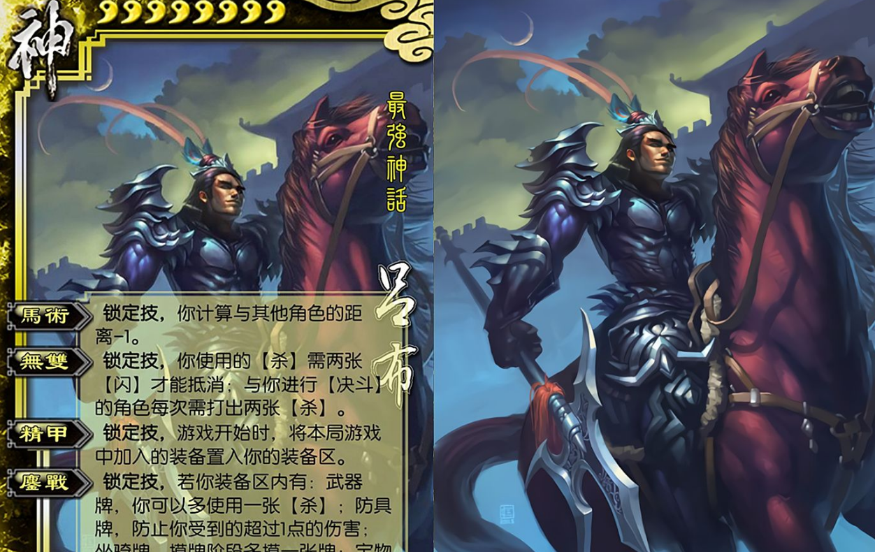 神吕布是《三国杀》中的第二位神将卡,他的技能“无双”让他成为游戏中的单挑王。