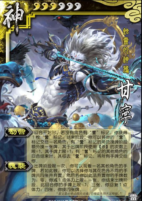 神甘宁是《三国杀》中的第三位神将卡,他的技能“魄袭”和“劫营”让他成为游戏中的阴间人物。
