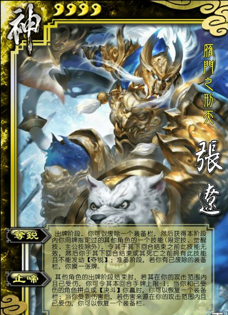 神张辽是《三国杀》中的第四位神将卡,他的技能“夺锐”和“止啼”让他成为游戏中的缝合武将。