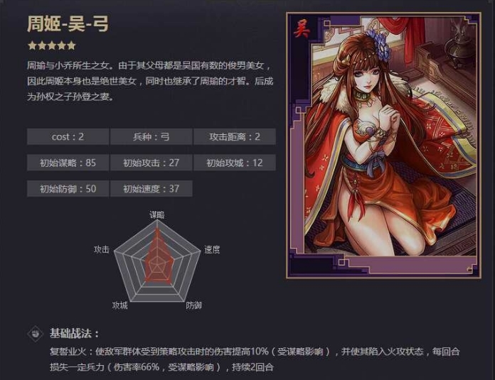 周姬在游戏中属于火攻类武将,其特色在于持续的高伤害输出以及提升策略伤害的能力。她的技能效果使得她在策略攻击型队伍中有着极高的价值,无论是作为主攻手还是辅助手,都能发挥出极大的作用。
