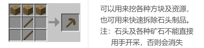 镐Pickaxe——材料:木棍加木板或圆石或铁锭或金锭或钻石