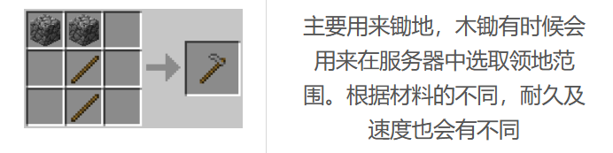 锄Hoes——材料:木棍加木板或圆石或铁锭或金锭或钻石