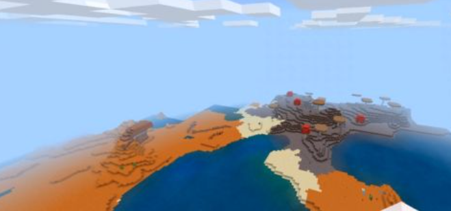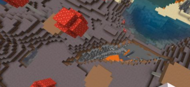 如图所示,在这个狭窄的区域内,居然同时出现了雨林、黏土山、蘑菇岛和雪原四大生物群系,这简直是一颗罕见的种子宝库。通常在《我的世界》中,能有一个这样的生物群系就已经非常难得,而这个种子却拥有四个,真是让人惊叹不已。