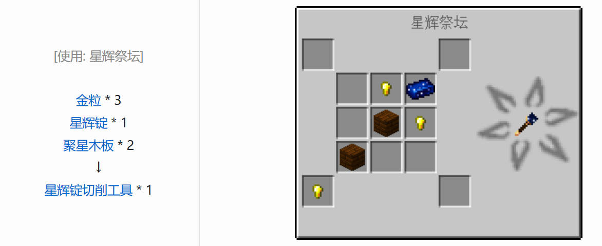 星辉锭切削工具只能在星辉祭坛制作。制作需要3个金粒、1个星辉锭和2个聚星木板。玩家可以在游戏中使用这些材料合成星辉锭切削工具,从而在探索和游戏中更轻松地处理星辉锭和水晶石。