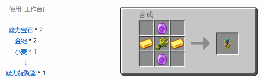 在我的世界中,魔力凝聚器可以在工作台中制作。制作它需要2个魔力宝石、2个金锭和1个小麦。当魔力凝聚器检测到作物生长、动物繁殖或怪物死亡时,它将生成魔源。