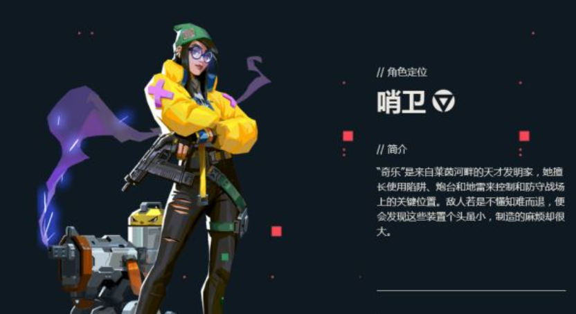 无畏契约中的奇乐,角色定位为哨卫,拥有强大的发明能力,可以布置战场装置。游戏中,她是莱茵河畔的天才发明家,用其强大的发明能力布置各种战场装置。是一个擅长使用陷阱、炮台和地雷来控制和防守战场上的关键位置的角色。