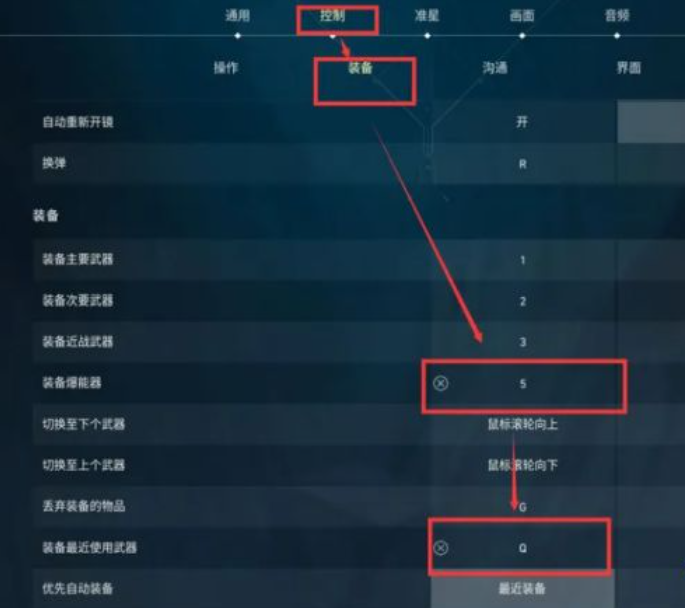 在控制设置中,将装备爆能器(即下包)改为5,将装备最近使用武器(切刀)改为Q键。如果你想使用其他按键作为切刀快捷键,可以根据个人喜好进行设置。