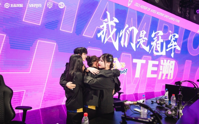 重新坐回舞台的TE溯战队没有再给对手拿分的机会,一鼓作气赢下了比赛。最后一把比赛结束时,选手们从座位上弹起,拥抱在一起。对抗路的何佳怡(ID:在野)、中路王沙沙以及射手王曼(ID:一曼)泪洒现场。