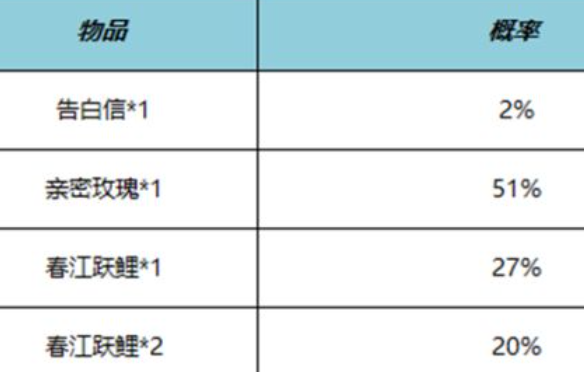 告白信礼包含有不同的物品,其概率如下:告白信1的概率是2%、亲密玫瑰1的概率是51%、浓情玫瑰1的概率是27%、浓情玫瑰2的概率是20%。