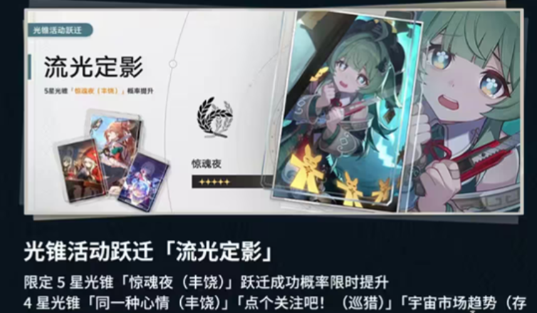 在光锥卡池方面,限定五星光锥为藿藿的专武【惊魂夜】,四星光锥为【同一种心情】、【点个关注吧】和【宇宙市场趋势】。尽管目前还没有关于五星光锥的具体消息,但作为藿藿的专武,它肯定会非常适合藿藿使用。而且,由于它是丰饶位的光锥,其泛用性应该不会太差,毕竟目前生命倍率和攻击倍率都有适合的角色可以使用。在四星光锥中,【同一种心情】是丰饶光锥中比较常见的下位替代,所有丰饶角色在没有更好的上位光锥时都可以使用它来替代。而【点个关注吧】则是巡猎光锥中目前比较难找到使用机会的光锥,【宇宙市场趋势】是一个能补充输出的存护光锥,但比较一般,只在特定环境下有需求,泛用性较低。关于光锥的抽取建议,首先要考虑到藿藿作为丰饶辅助位角色,对光锥的需求应该不会太高,可以使用各种四星下位替代,甚至活动赠送的一些光锥也可以使用。因此,预算有限的玩家可以跳过此次光锥卡池,不抽取专武,或者考虑进行一二十次的垫抽,万一抽中了也是不错的选择。如果没有抽中,也可以试着抽取【同一种心情】。
