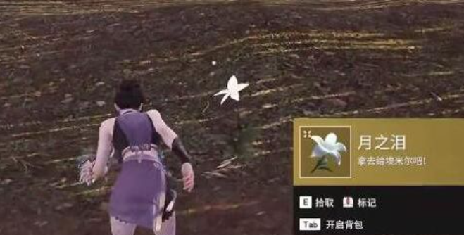 到达冻土滩后,你可以在附近找到一些白色的花朵,这些花朵就是月之泪。你可以通过点击鼠标右键或者使用武器攻击来将月之泪收集起来。