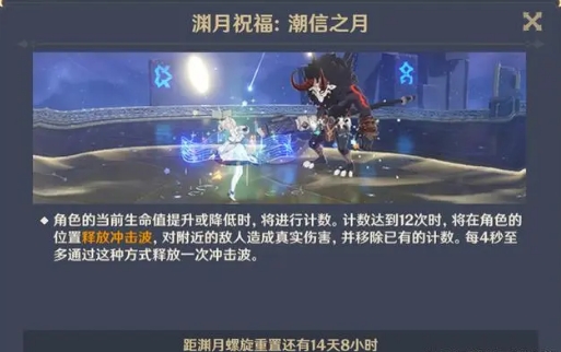 本期深渊的渊月祝福效果是“生命值发生变动时,进行计数,达到12次后,会释放冲击波,每4秒至多释放一次,冲击波伤害在2w左右”。这个效果主要对一些高生命值的敌人有明显作用,如火螃蟹、火史莱姆等。但实际上能做到的助力并不太多,因此玩家在选择队伍时需要注意敌人的属性,避免受到不必要的伤害。