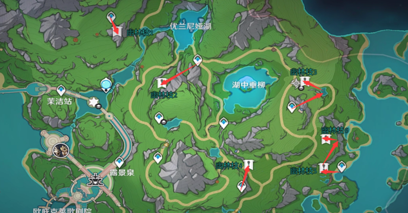 锚点出来往小地图南方向的山顶爬上去,完成水微粒收集挑战,开启挑战的精致宝箱获得幽林枝1