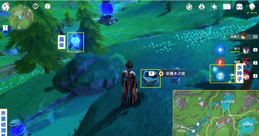 拾取水种子在水池旁附着水元素等待形成水核,将水核放入装置内;