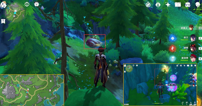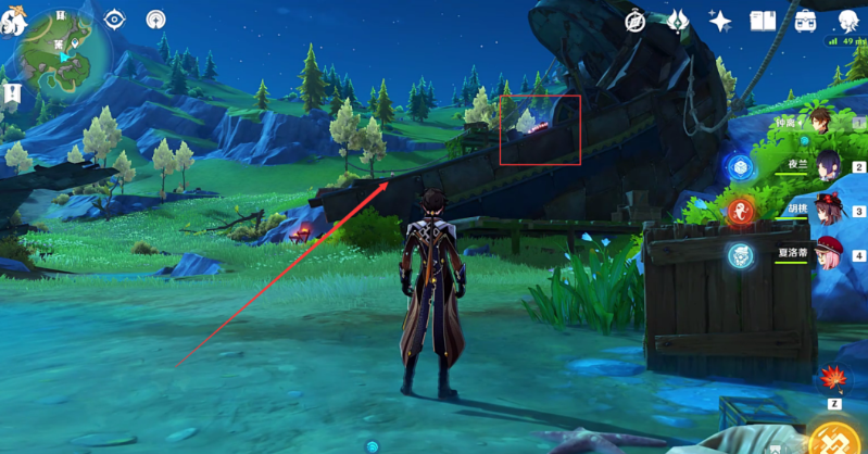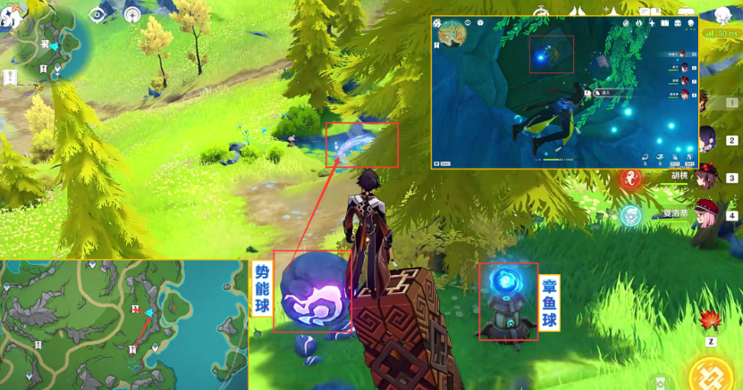 ①来到下图位置拾取章鱼球,使用水流技能将势能球发射到水池紫圈处,过去下潜入水,进入洋流传送,抬头往上看,开启珍贵宝箱获得幽林枝6。