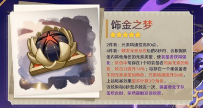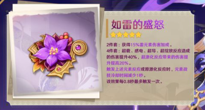 2如雷的盛怒+2流浪大地的乐团/饰金之梦:提供80精通和15%雷元素伤害加成。