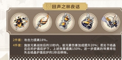 回声之林夜话是针对岩元素输出角色设计的圣遗物套装。它的2件套效果是提高18%的攻击力,这是一个比较通用的属性,可以适用于大多数依赖攻击力的角色。而它的4件套效果则比较特殊,需要满足一定的条件才能触发。