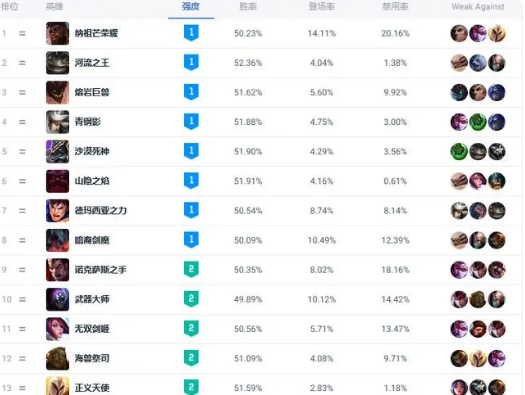 除了奎桑提之外,还有许多其他英雄也在当前版本中表现出色。例如,塔姆和石头人这两个英雄的实力也十分强大。他们都有着高生命值和强大的控制技能,可以在团战中为队友提供有力的支持。诺手虽然在过去的版本中一直表现出色,但在当前版本中他的胜率和出场率都有所下降,排名也相应下滑。