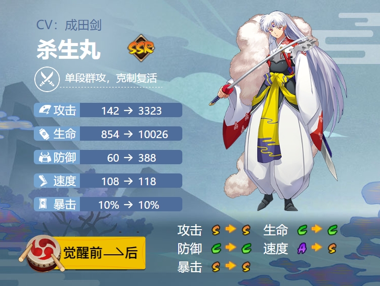 从属性上来看,杀生丸拥有攻击、速度和暴击等属性加成,可以发挥出强大的实力。他的普攻可以持续输出并且可以通过叠加虚化效果来提高自身的战斗能力;二技能可以造成高额伤害并且可以无视敌人的防御力;三技能可以在生命值较低时保证自己的生存能力,并且可以反击敌人。这些技能使得杀生丸在战斗中可以发挥出强大的作用。